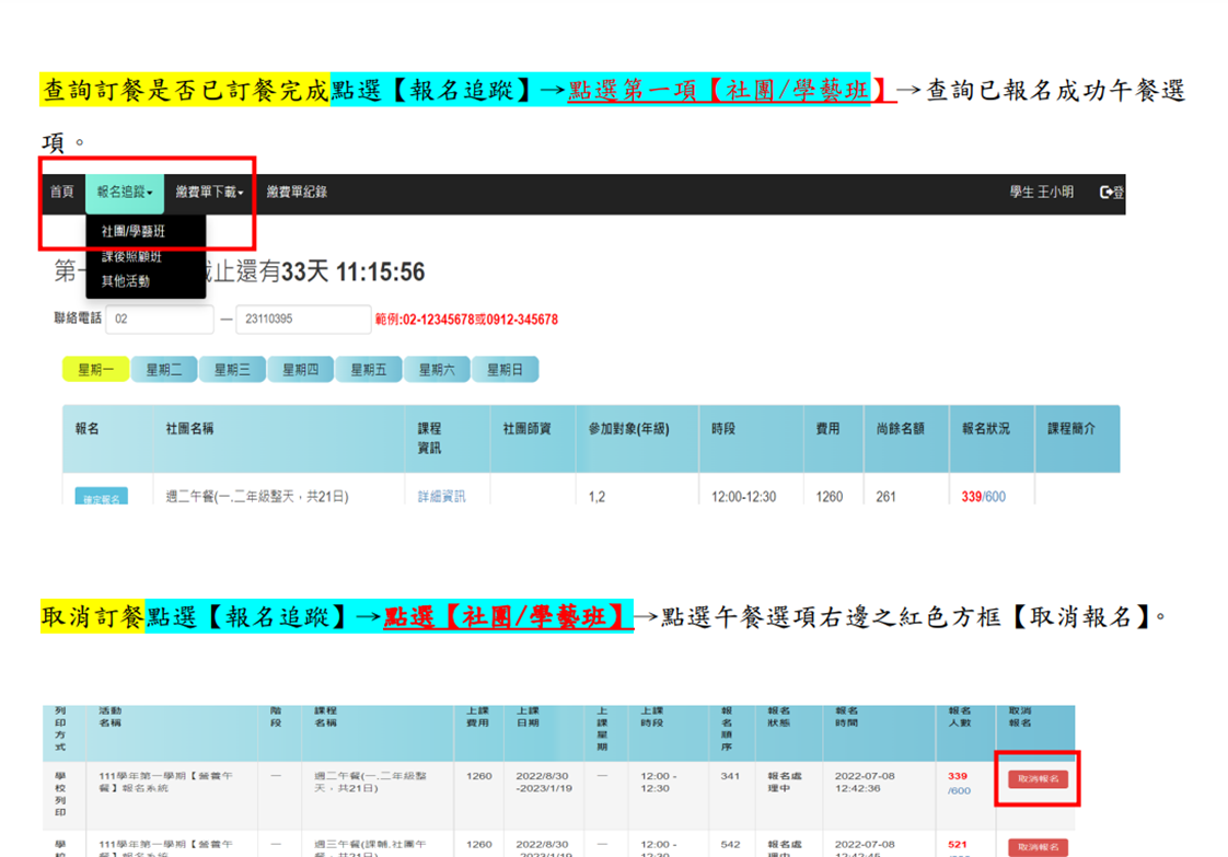 訂餐截止日前,如有訂餐項目需取消,請自行到訂餐系統【報名追蹤】點選【社團/學藝班】之頁面進行取消。