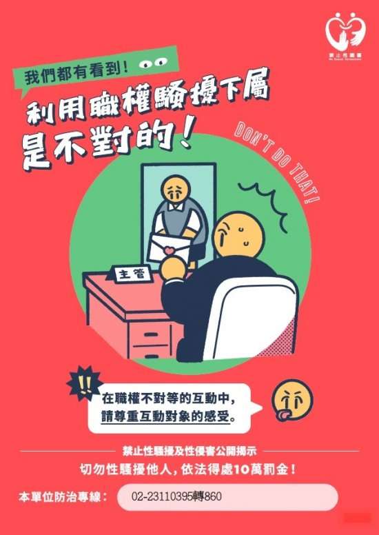 二、檢附勞動部製作之「禁止職場性騷擾(含申訴管道)範本」、衛生福利部製作之「禁止性騷擾LOGO」及「在職權 不對等的互動中請尊重互動對象的感受」宣導海報、本府 人事處整理之「職場性騷擾形式及常見態樣」(引自勞動 部「職場性騷擾申訴處理指導手冊【113年5月編印】」) 各1份,請善加運用並以書面、電子傳輸或其他可隨時取得 查知之方式公開揭示之。