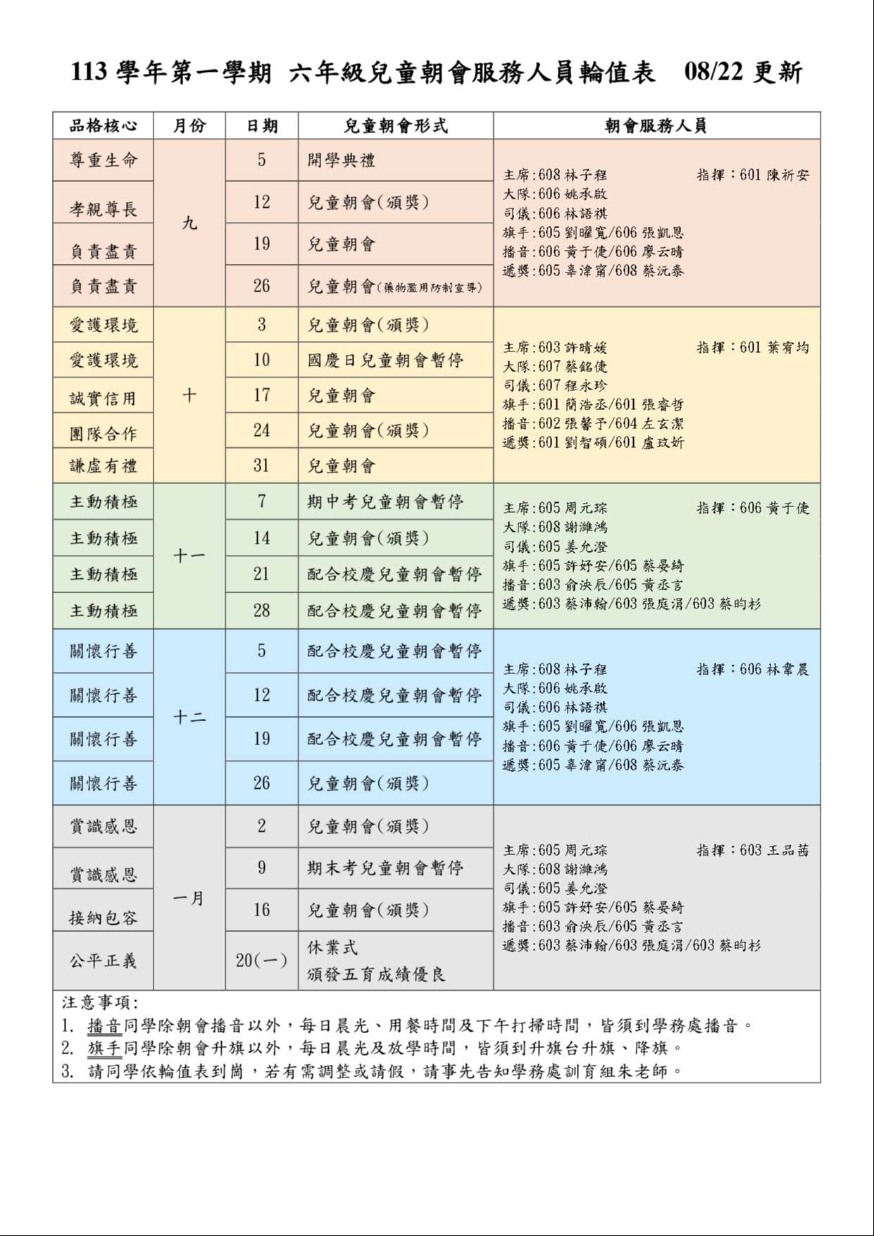 二、113-1朝會服務人員輪值表、本學期品格核心、朝會形式表如附件