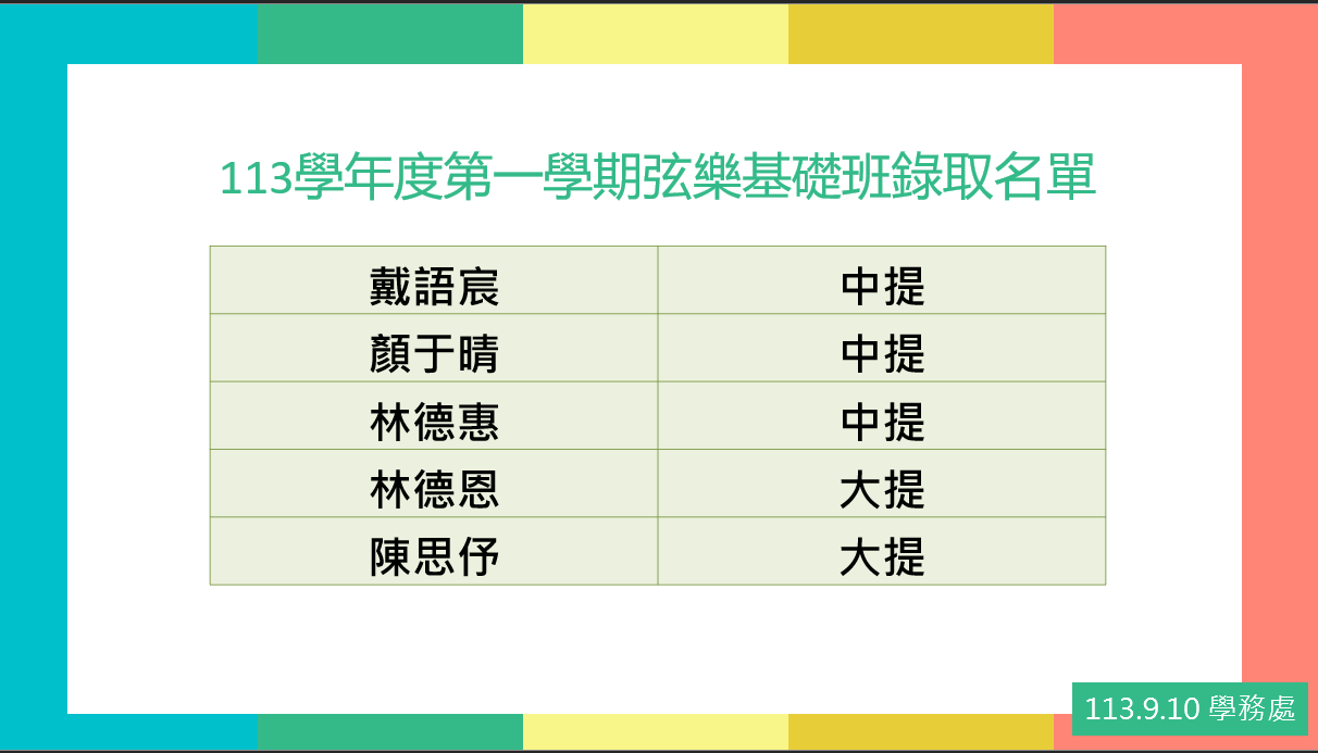【招生結果】本校113學年度第一學期弦樂團基礎班招生結果,恭喜以下學生加入弦樂團基礎班!