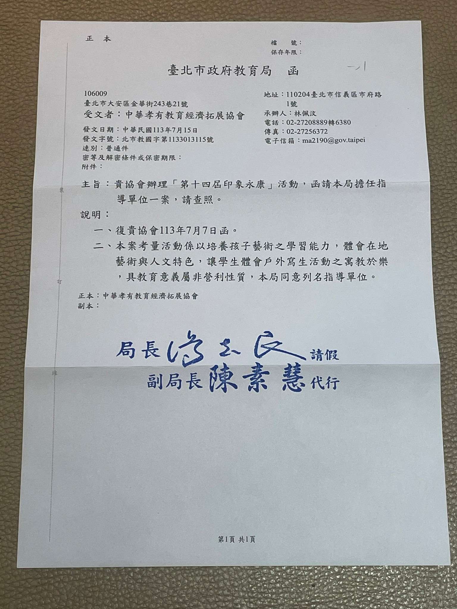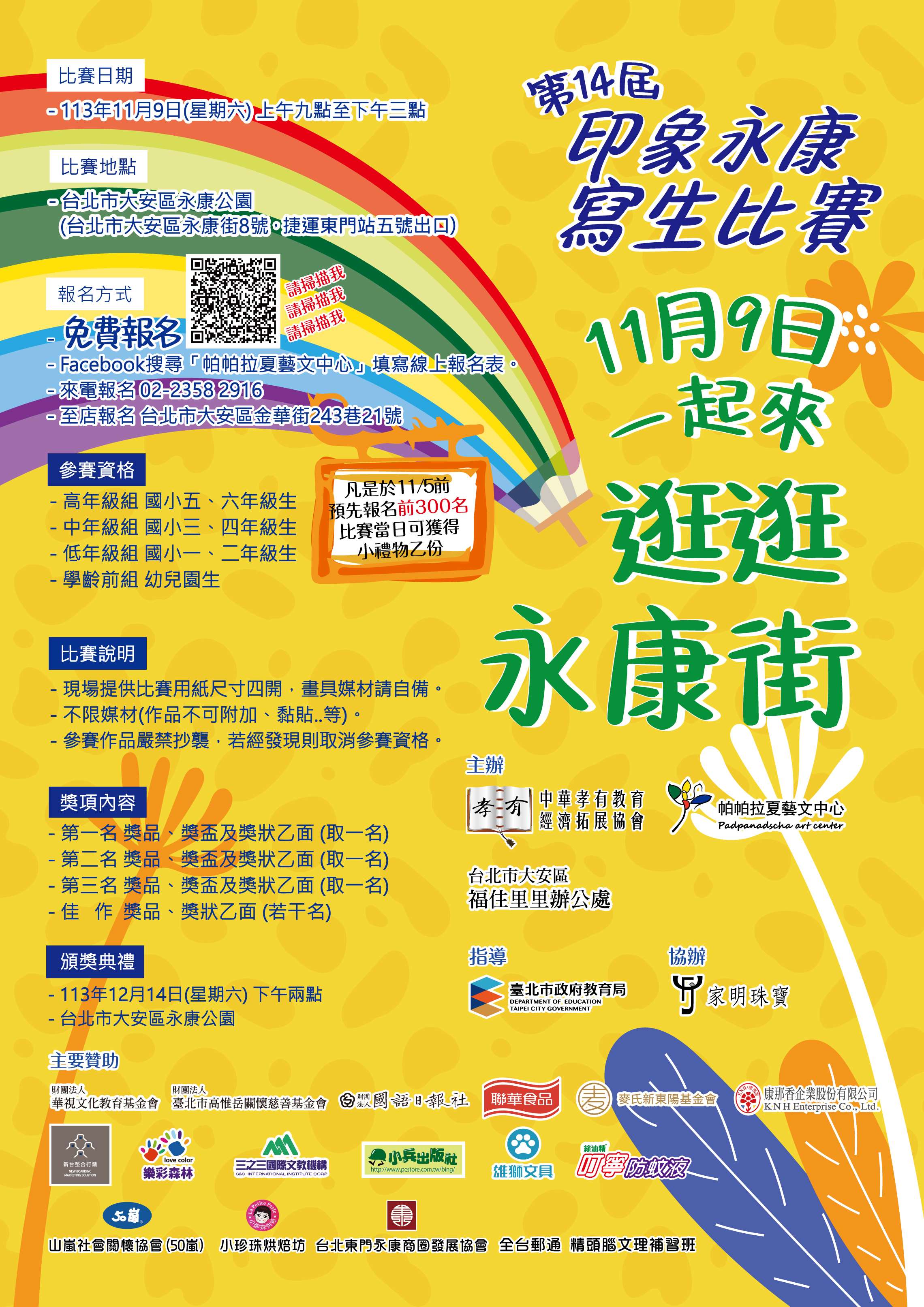 中華孝有教育經濟拓展協會,今年將如期舉辦第十四屆印象永康寫生比賽,感謝台北市教育局協助推廣本活動,內文如下: