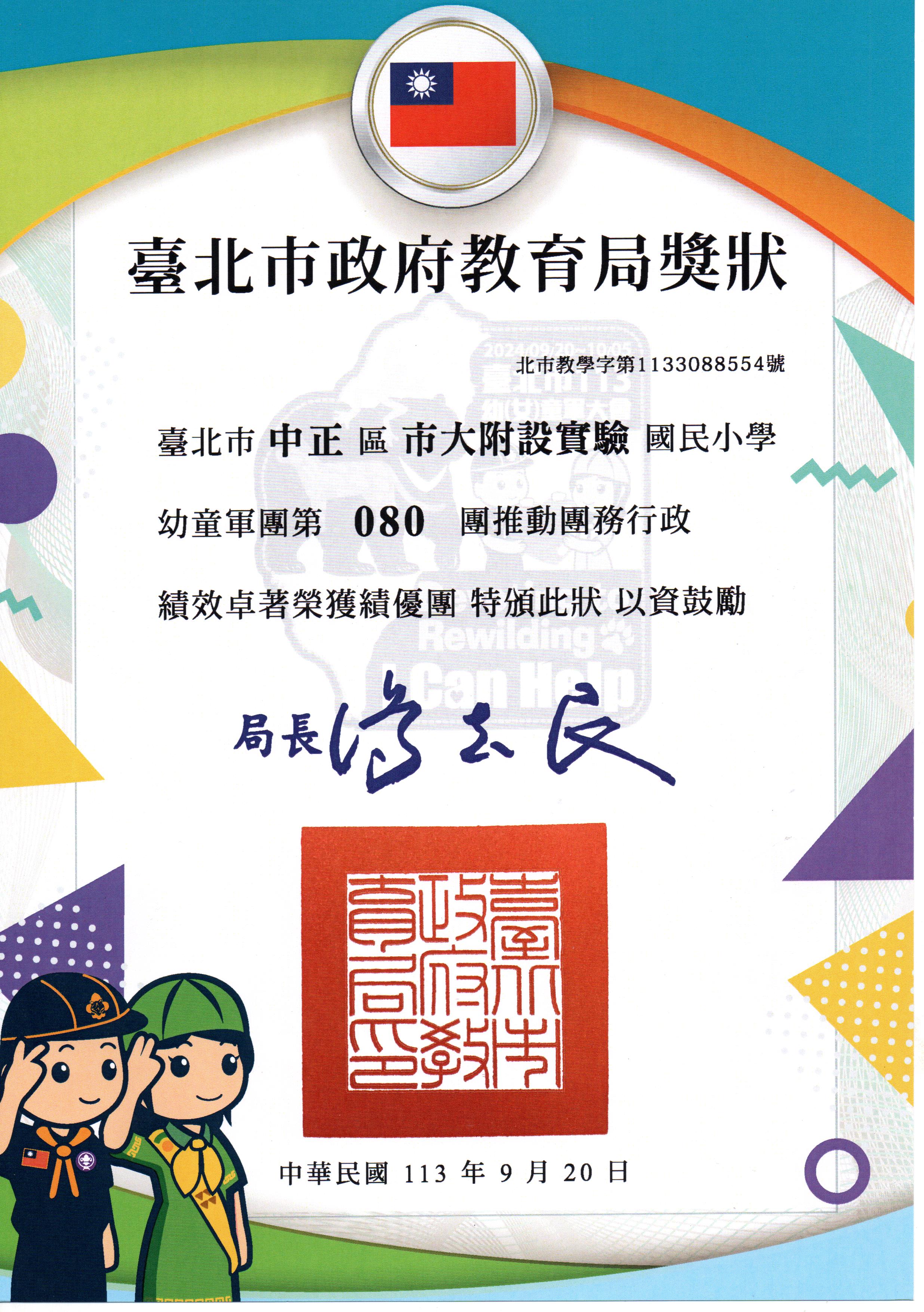恭喜!本校幼童軍團第080團推動團務行政績效卓著榮獲績優團