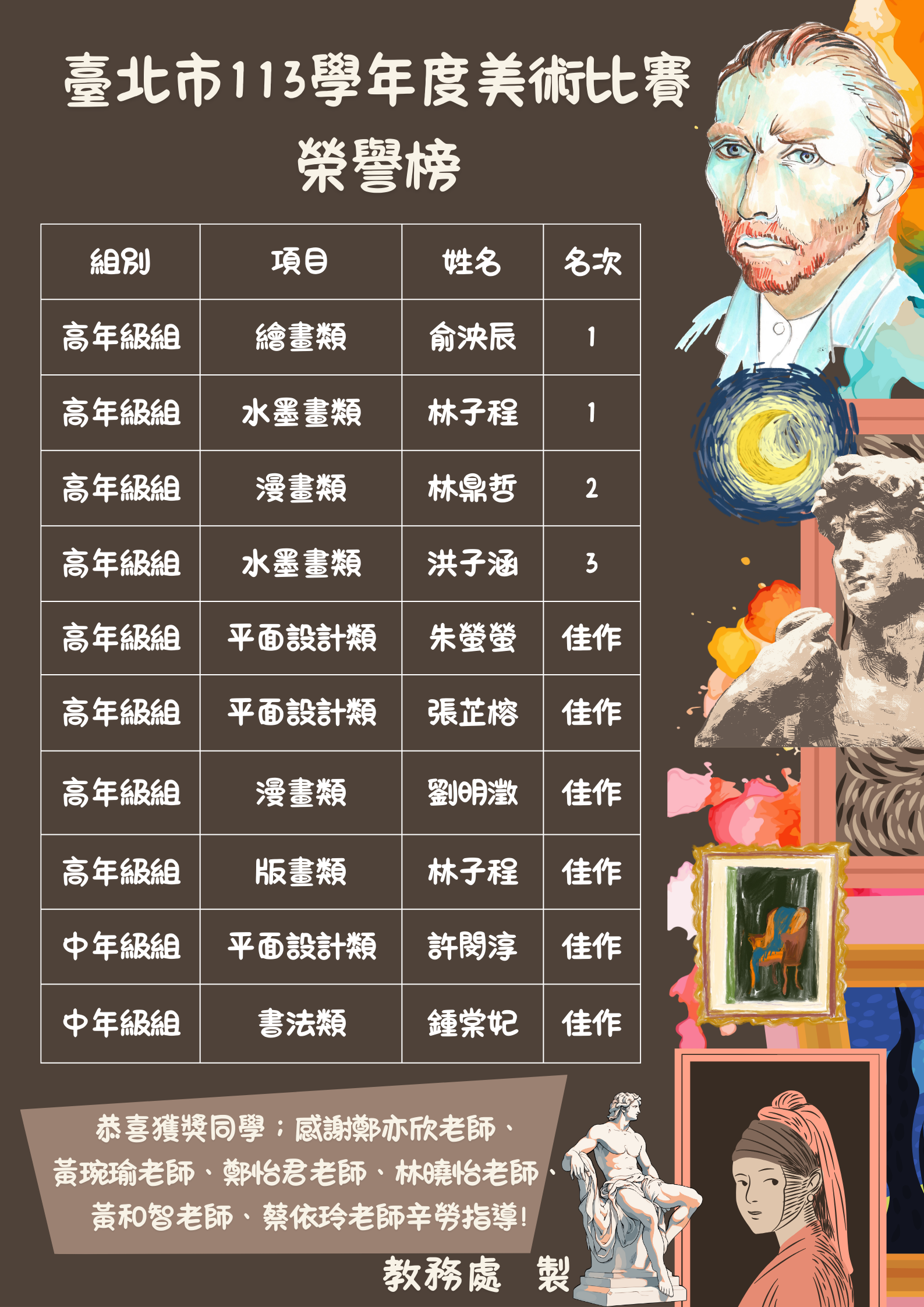 主旨:狂賀!!!本校學生參加臺北市113學年度美術比賽榮獲佳績!