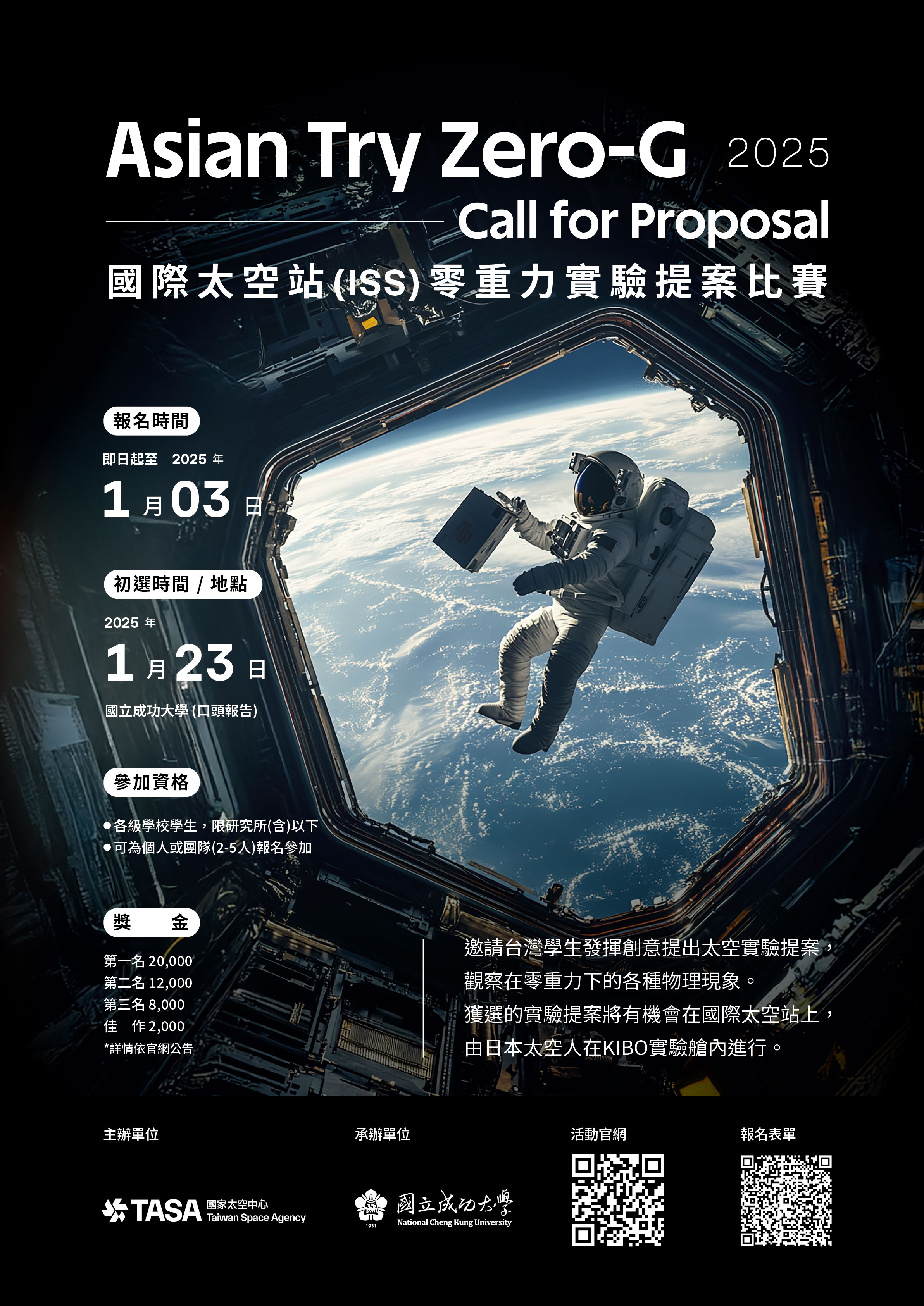 「2025國際太空站(ISS)零重力實驗提案比賽」即日起受理報名至2025年1月3日止,詳如附件檔案。
