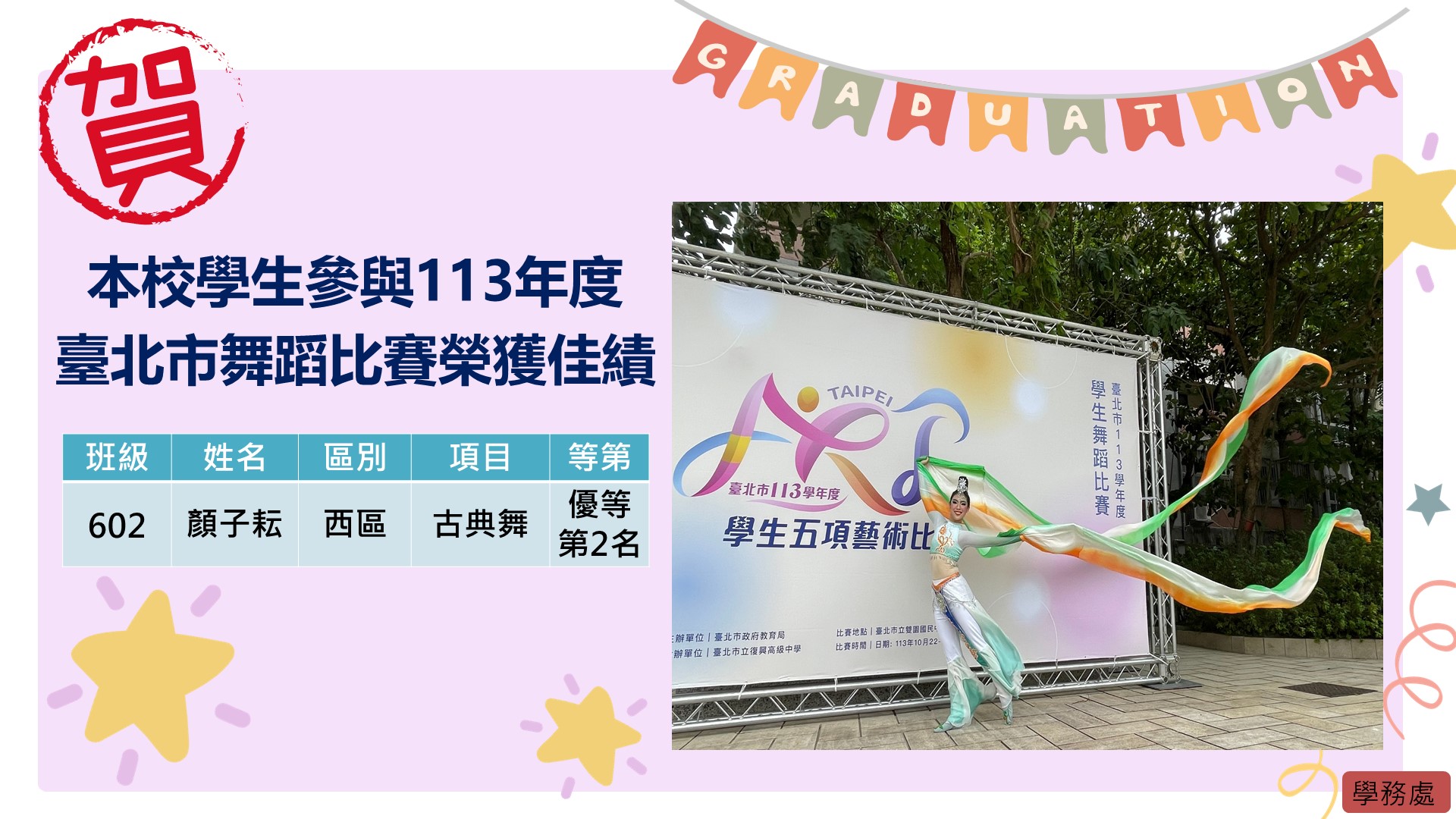 賀!本校學生顏子耘 參與113學年度臺北市五項藝術比賽─舞蹈類 個人組 成績優異