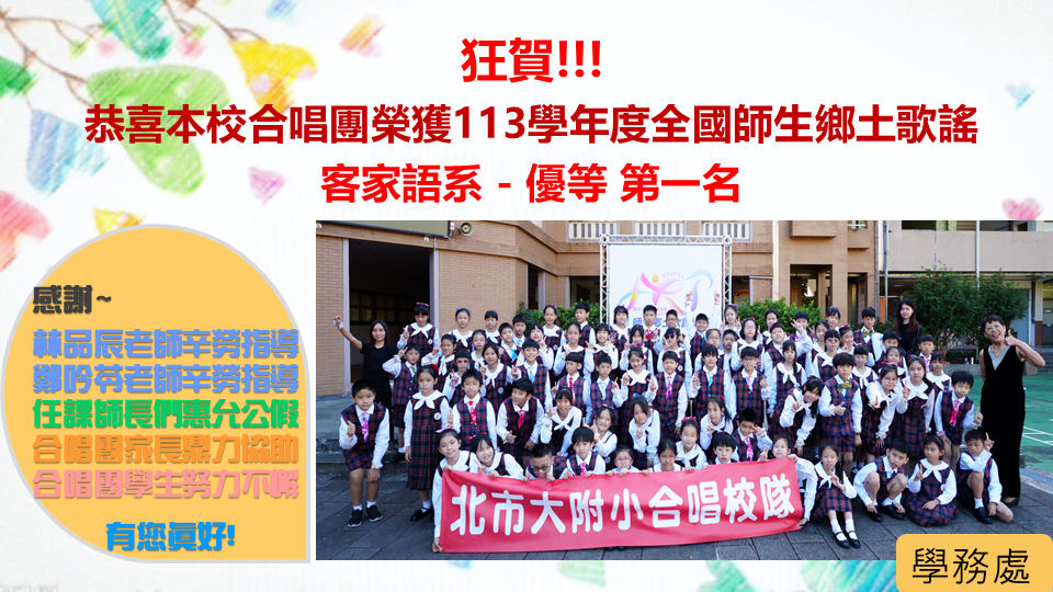 狂賀!!! 恭喜本校合唱團榮獲臺北市113學年度師生鄉土歌謠比賽 客家語系類-優等 第一名(附含比賽實況連結) 內含比賽實況連結:https://www.youtube.com/watch?v=5yDNgAcMI6E