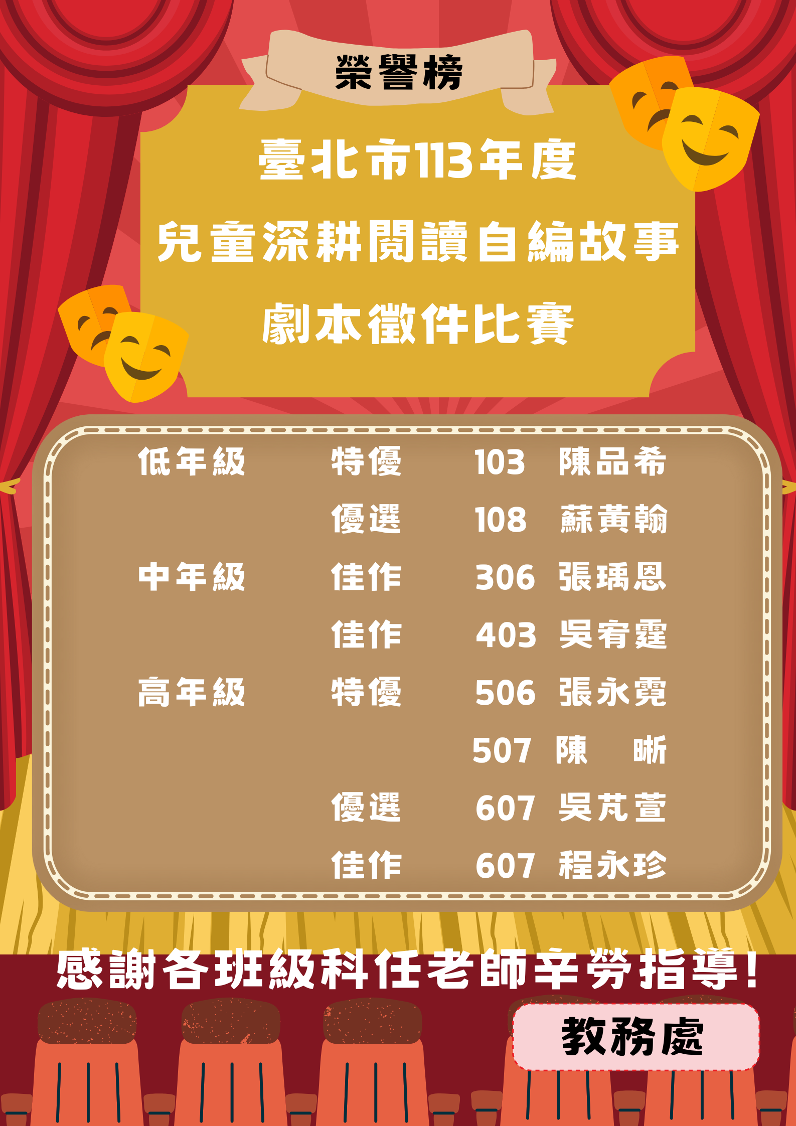主旨:狂賀!!!本校學生參加臺北市113年度兒童深耕閱讀自編故事劇本徵件比賽榮獲佳績!