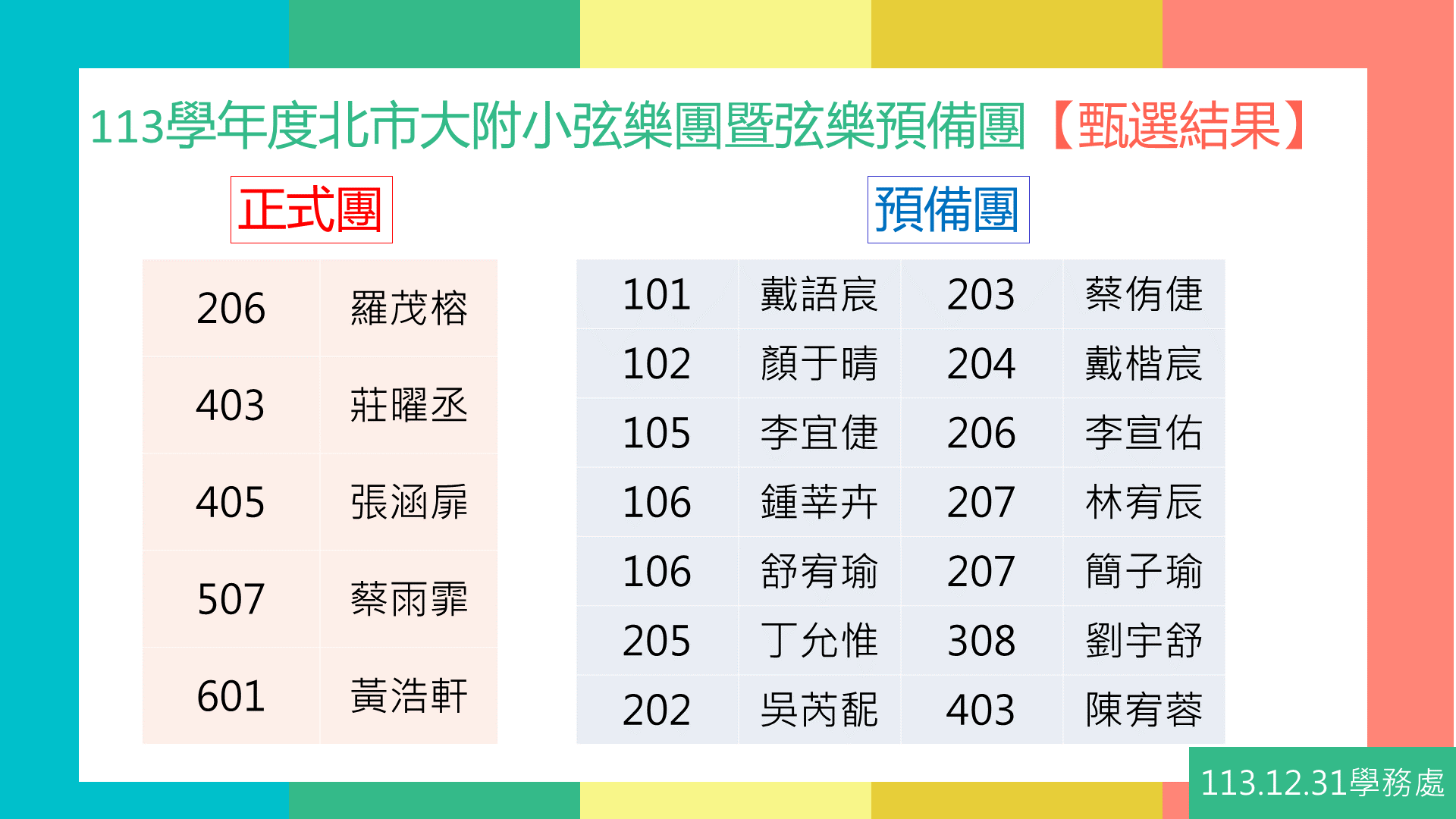 【招生甄選結果】本校113學年度第二學期弦樂團暨預備團甄選結果,恭喜錄取的學生。