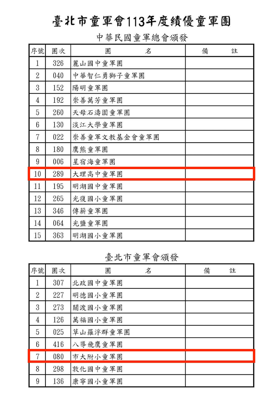 恭喜!本校童軍團榮獲「臺北市童軍會113年度績優童軍團」殊榮,感謝李勇毅團長的帶領與付出!