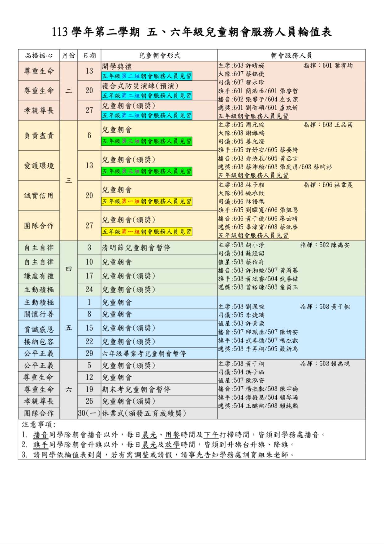 二、113-2朝會服務人員輪值表、本學期品格核心、朝會形式表如附件