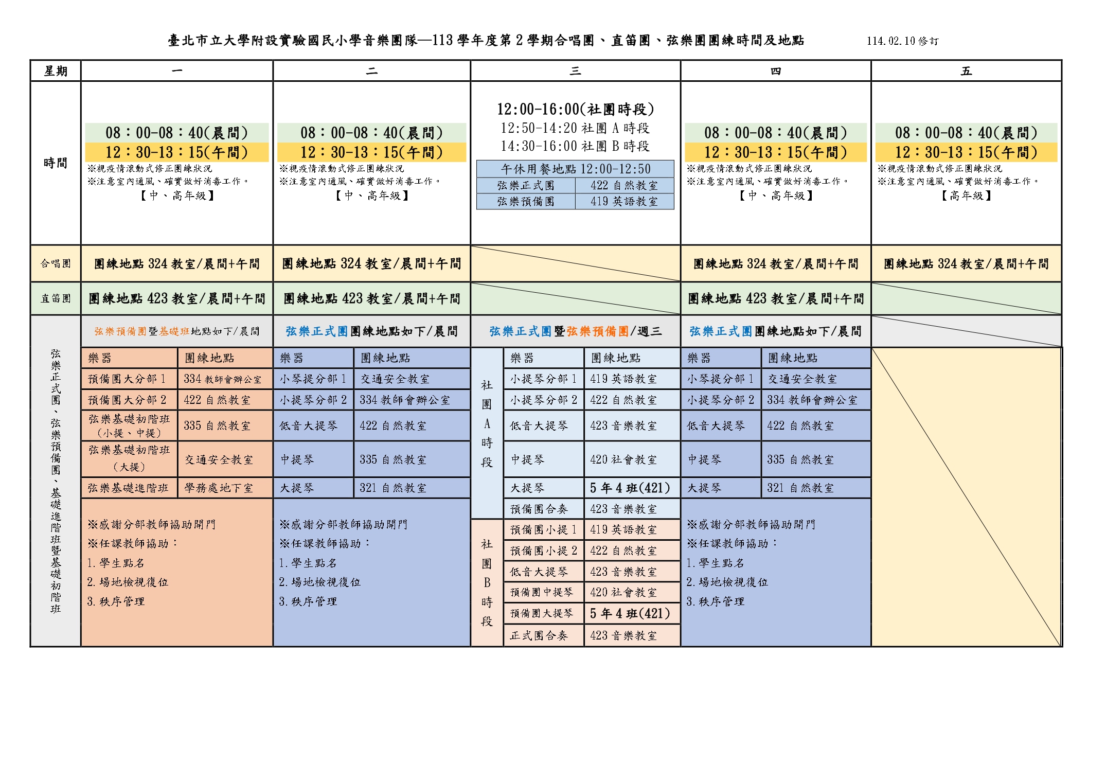※ 弦樂正式團團練─114/2/13(四)日起每週一、二、四晨間及週三下午(114/2/12起)進行團練