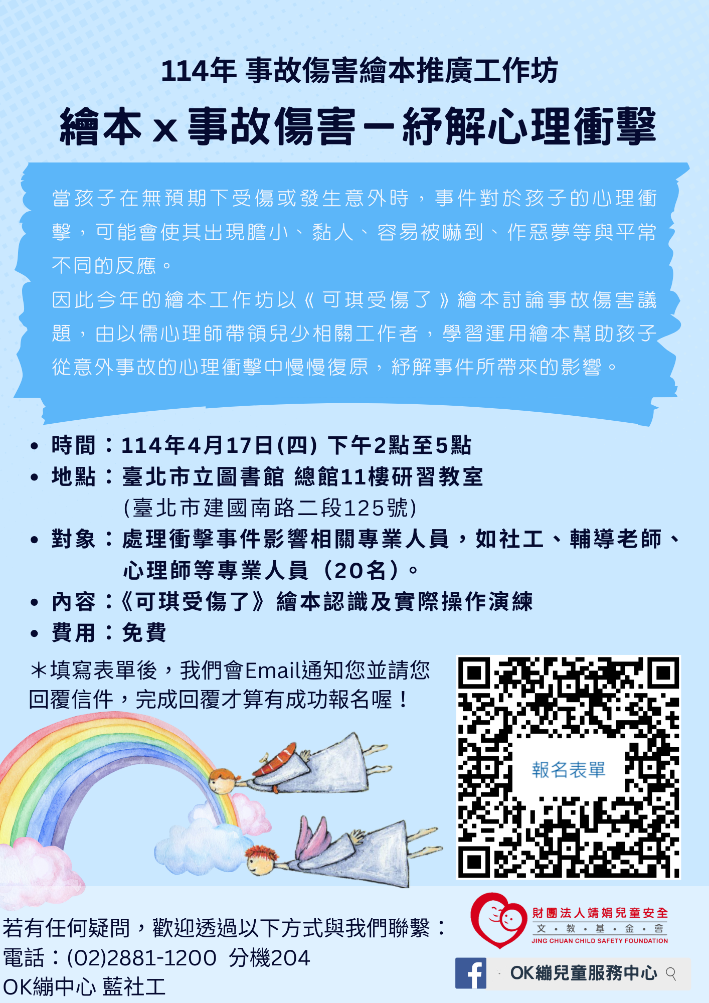 轉知:OK繃兒童服務中心於114年4月17日辦理「事故傷害繪本推廣工作坊《繪本x事故傷害—紓解心理衝擊》」