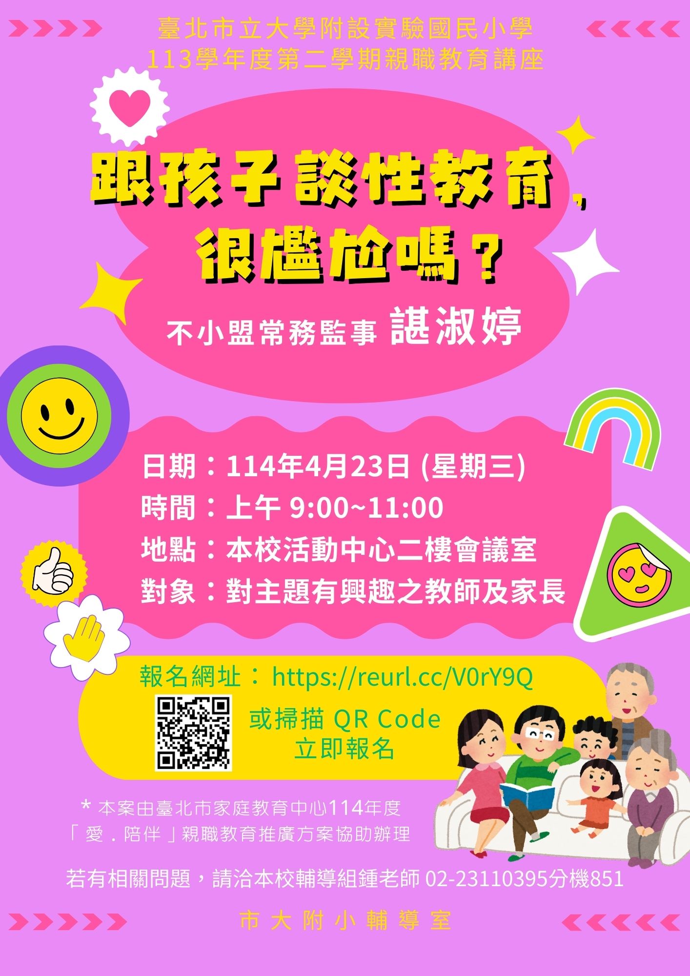 【親職教育】本校辦理113學年度下學期親職教育講座~4/23(三)上午9:00「跟孩子談性教育,很尷尬嗎?」,歡迎報名參加!
