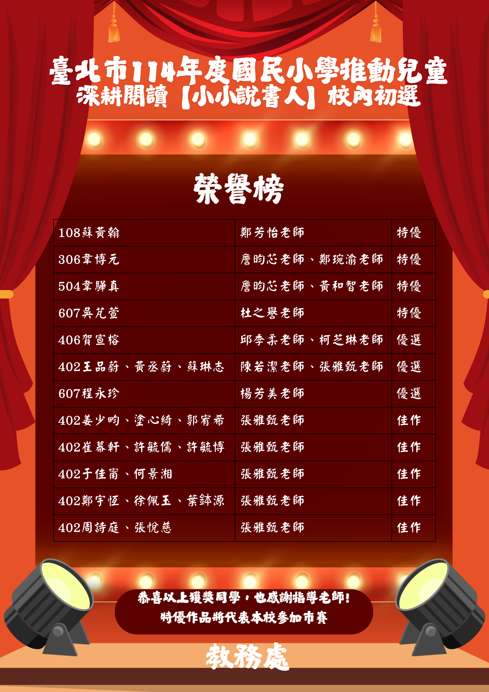 主旨:114年度臺北市推動深耕閱讀小小說書人校內初選結果