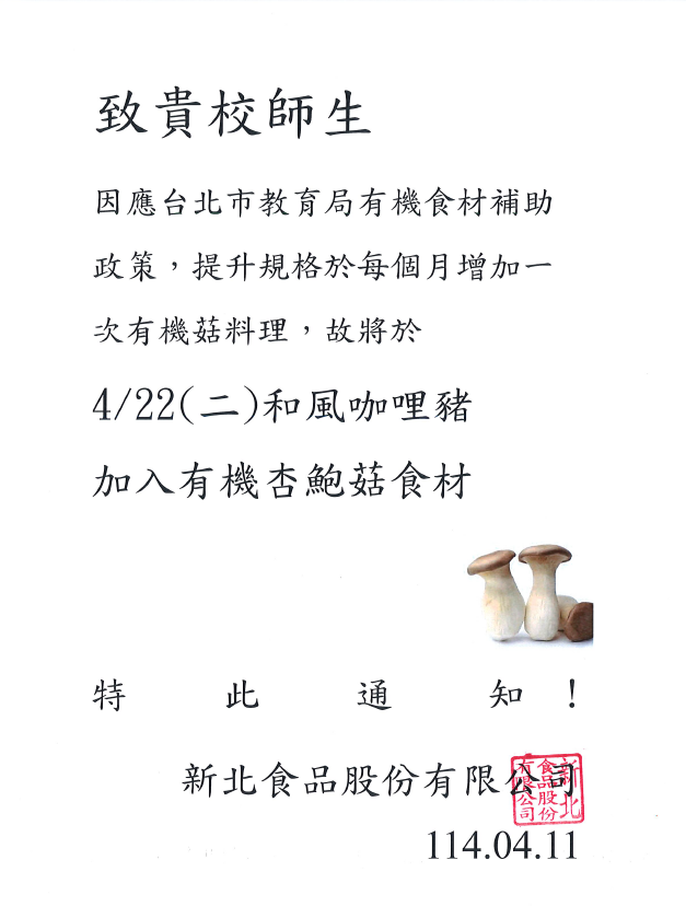 114年4月22日營養午餐菜單主菜和風咖哩豬另加入有機杏鮑菇食材。