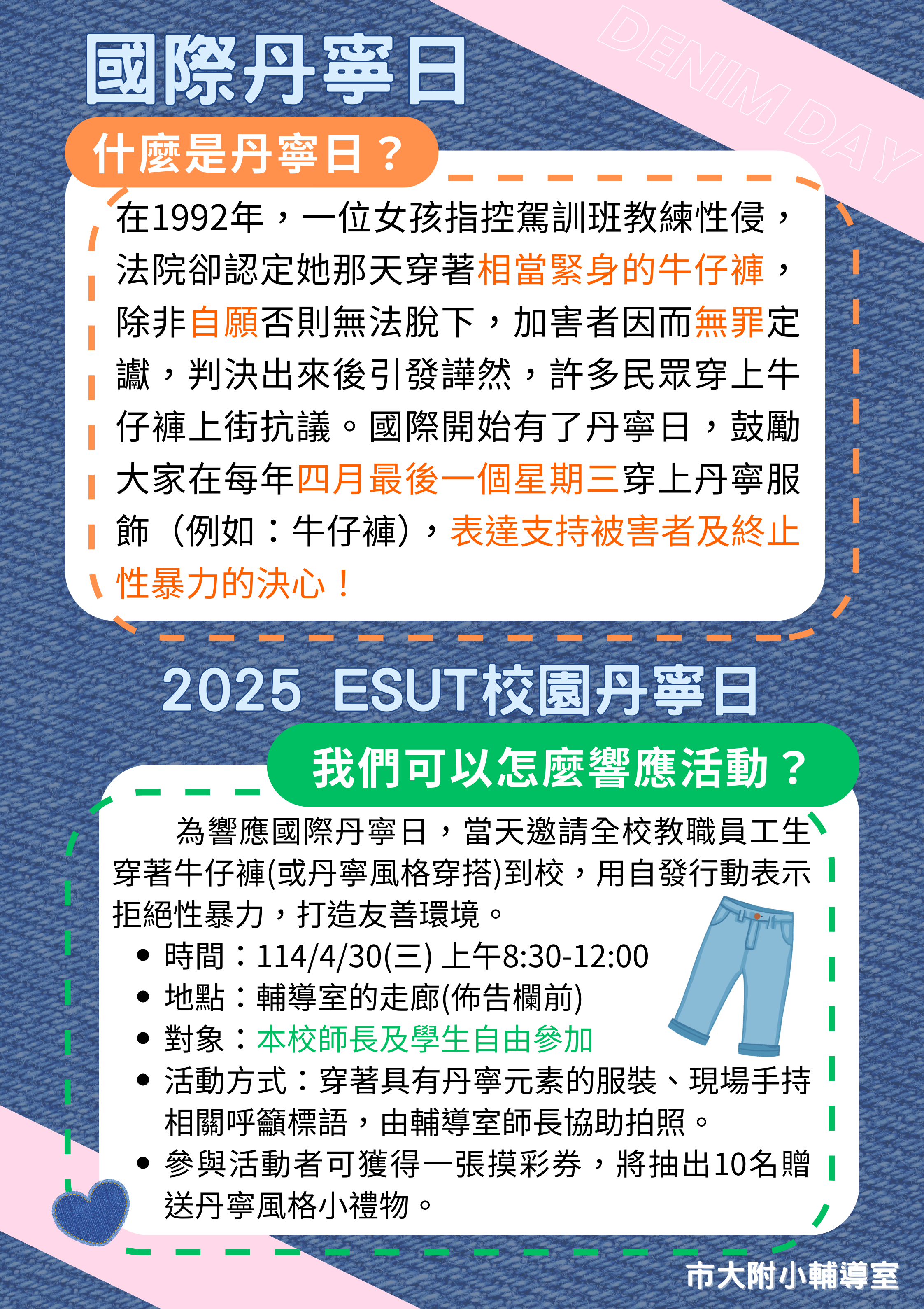 邀請本校教職員工生響應4/30(三)「國際丹寧日」,拒絕性暴力、打造友善環境!