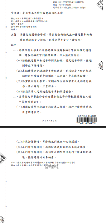 如遇送餐人員推送營養午餐桶餐,請學生避免走在餐車前後面及注意自身安全。