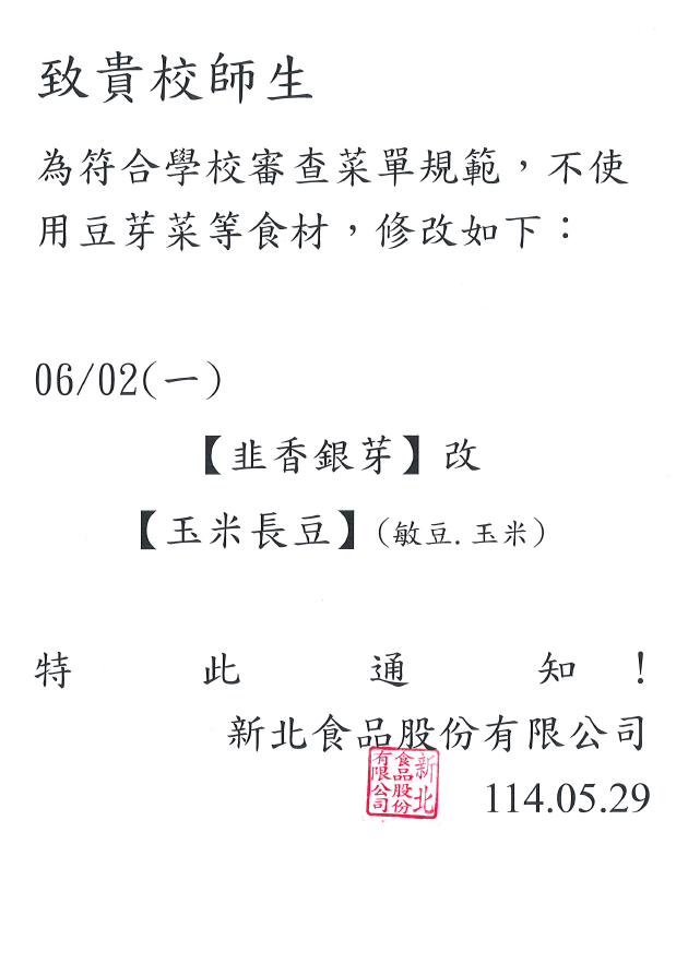 114年6月2日營養午餐菜單副菜【韭香銀芽】改為【玉米長豆】改菜通知。
