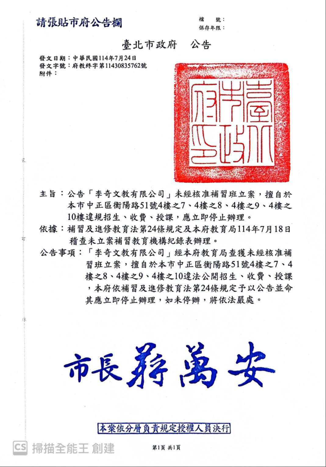 二、「李奇英文」(李奇文教有限公司)經本局查獲未經核准補習班立案,擅自於本市中正區衡陽路51號4樓之7、4樓之8、4樓之9、4樓之10樓違法招生、收費、授課,經市府依補習及進修教育法第24條規定裁處及公告,並命其立即停