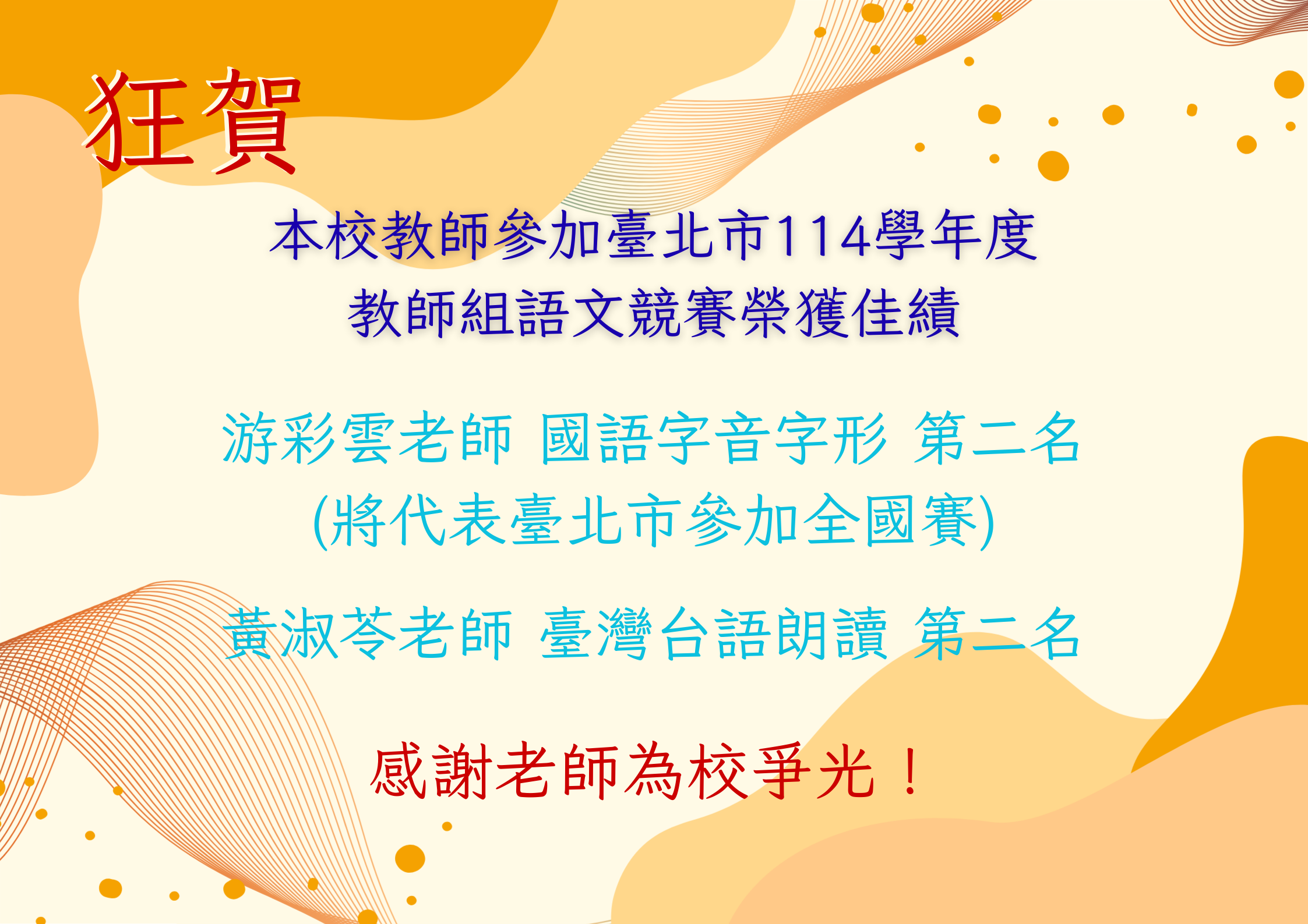 「狂賀」臺北市114年教師語文競賽榮獲佳績游彩雲老師 國語字音字形 第二名,將代表臺北市參加全國賽。