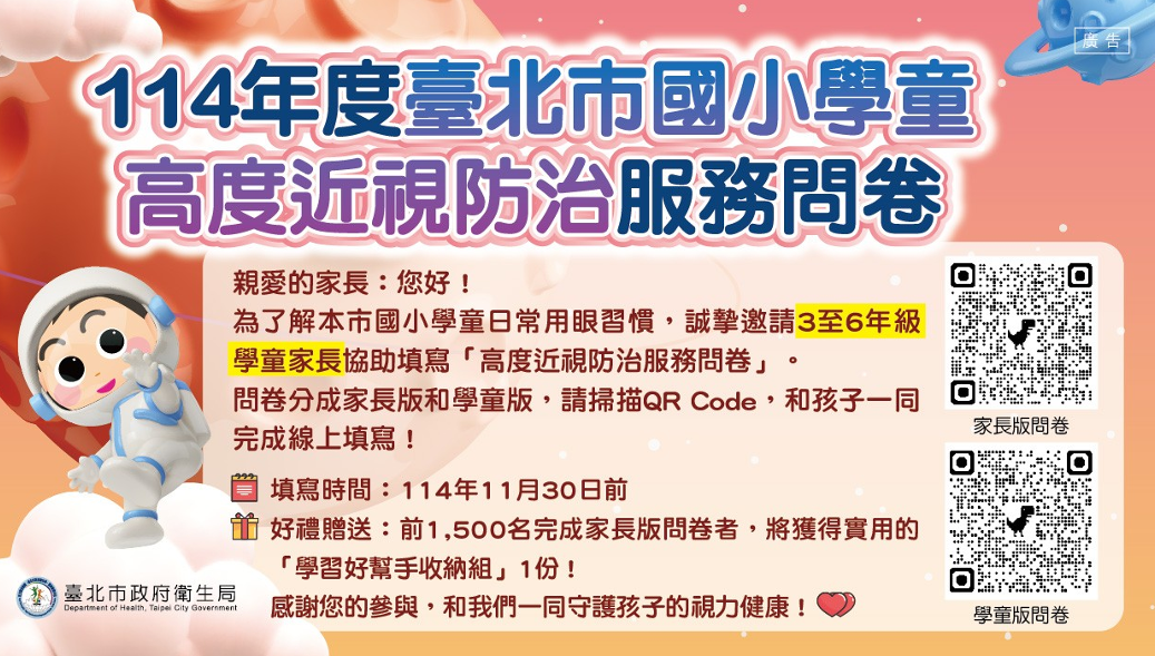 您好,衛生局辦理「114年度臺北市國小學童高度近視防治服務問卷」,作為兒童近視防治策略的參考。