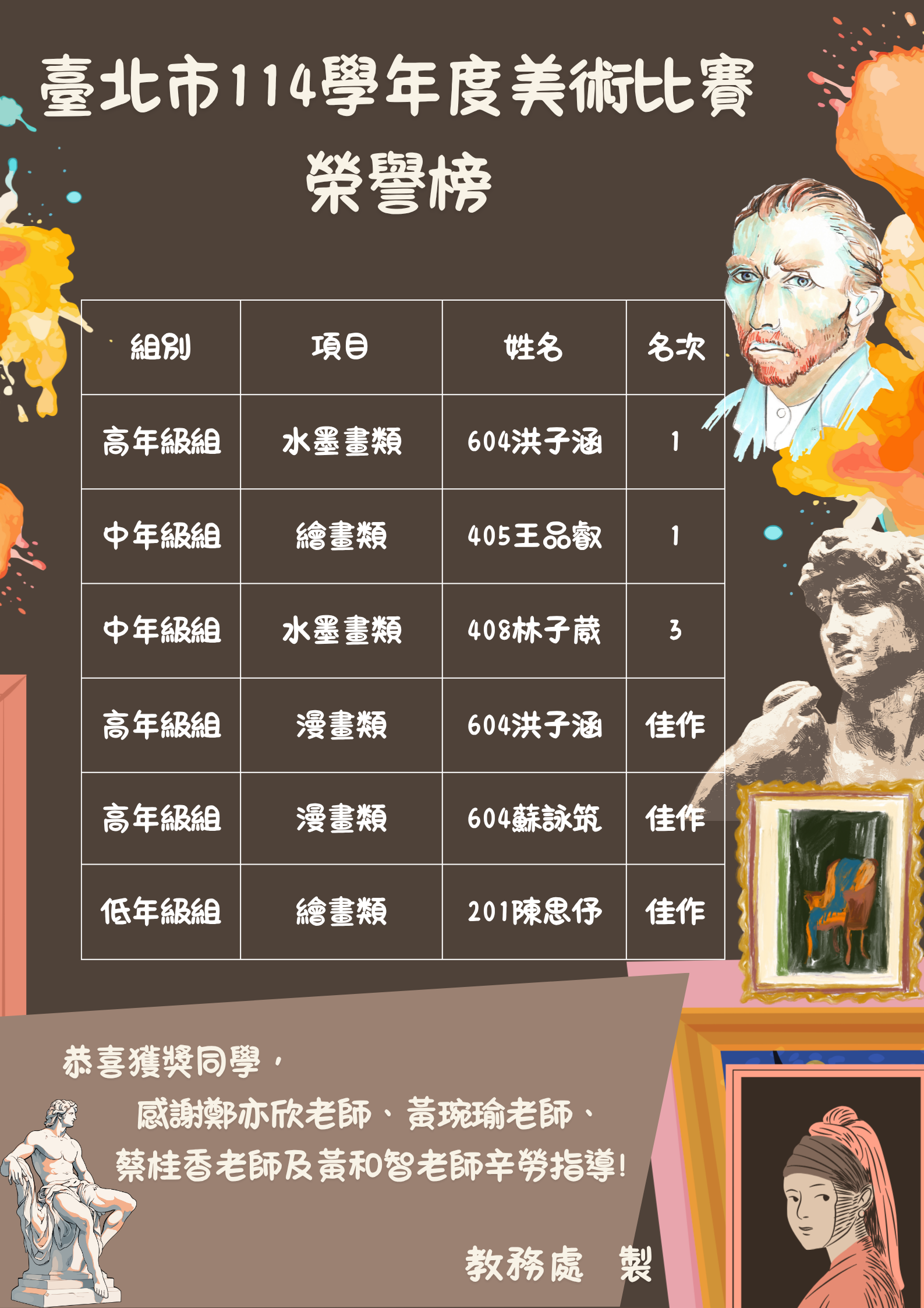 主旨:賀!!!本校學生參加114學年度臺北市美術比賽榮獲佳績(11/13週四於兒童朝會頒獎)~