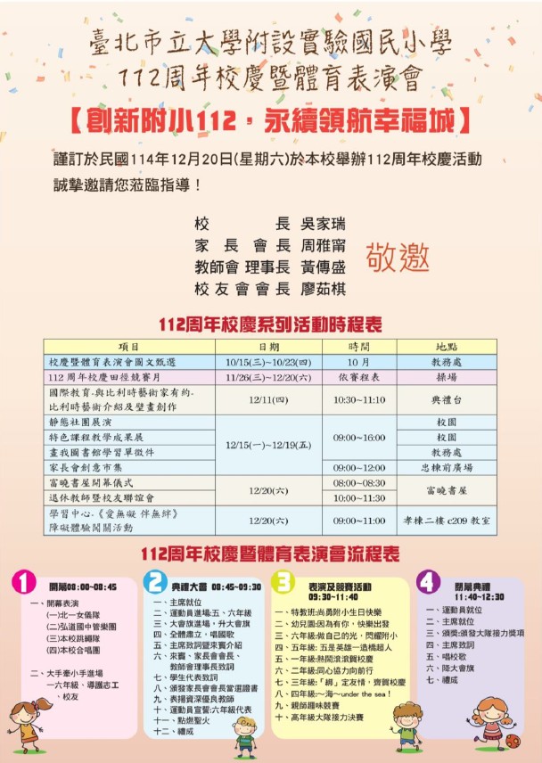 本校將於12月20日(六)舉辦112周年校慶暨體育表演會,歡迎家長、校友、退休教師、畢業生回來共襄盛舉!校慶補假時間為12月26日(五),校慶相關訊息請至112周年校慶專區