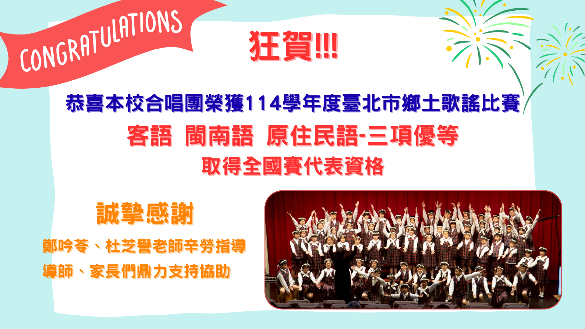 恭喜!!本校合唱團榮獲114學年度臺北市師生鄉土歌謠比賽 客語 閩南語 原住民語 三項優等