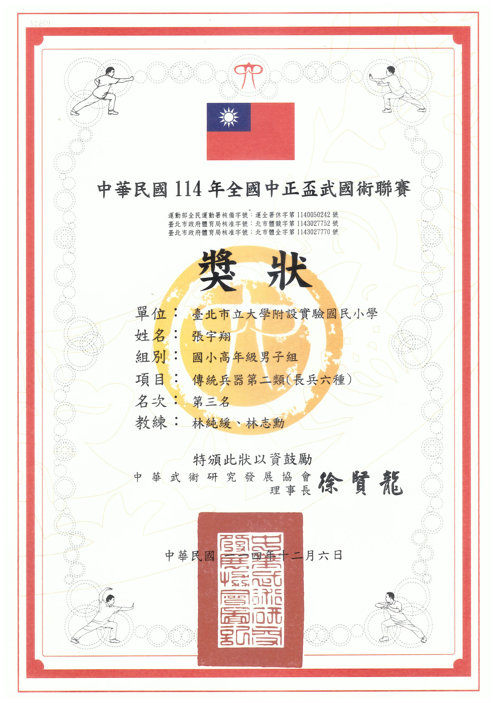 國小高年級男子組 傳統南拳第二類(粵系長橋) 第二名國小高年級組 傳統兵器第二類(長兵六種) 第三名
