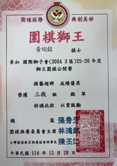 國際獅子會25-26年度獅王圍棋公開賽 三段組 殿軍