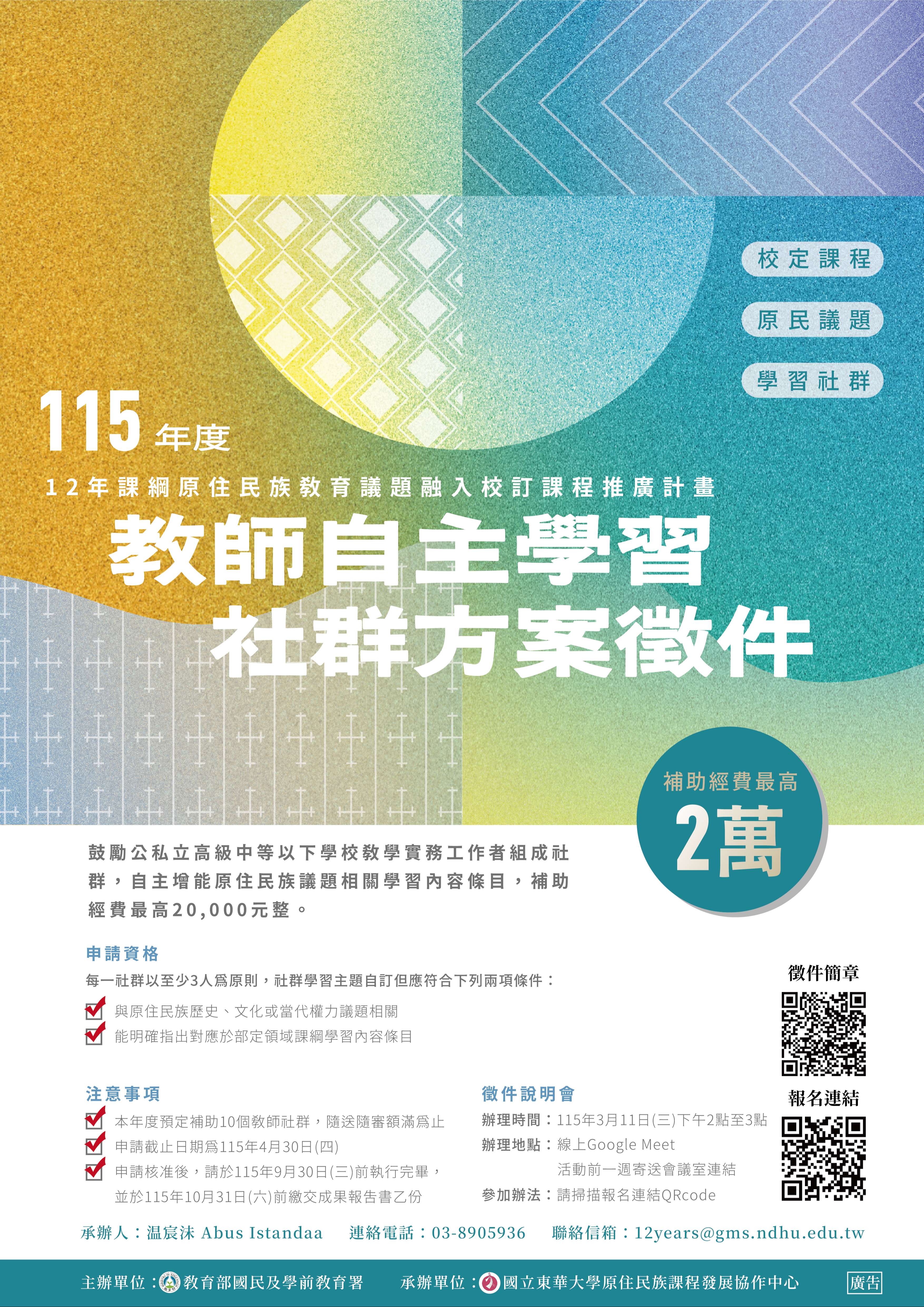 二、因應十二年國教課綱正式實施,為協助教師及學校落實原住民族議題融入各學習領域及課程,爰辦理旨揭方案,補助教師組成學習社群,進行相關學習內容之自主增能,以提升教師對原住民族教育議題之理解,並推動全民原住民族教育理念之落實。