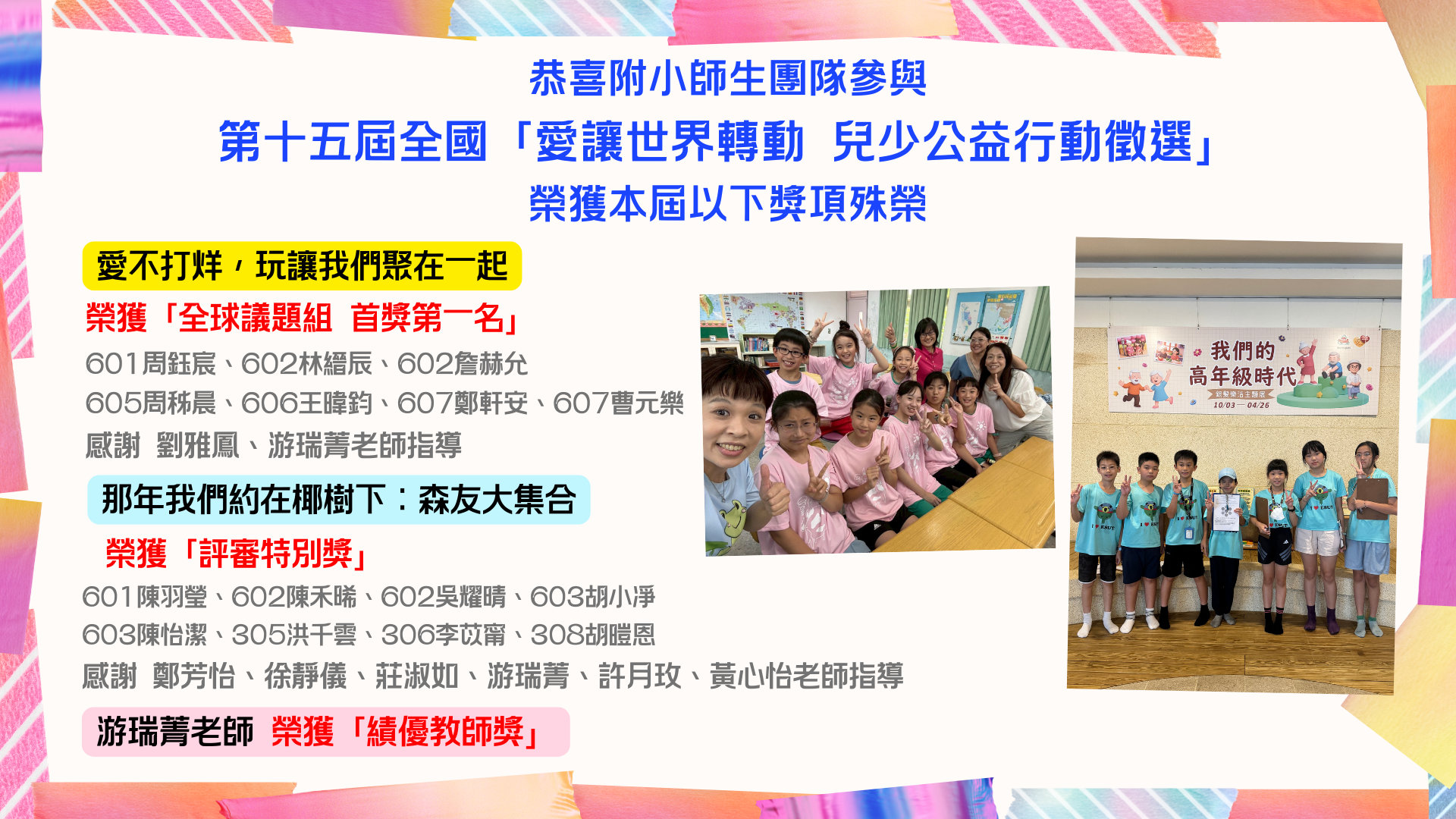 學生:601陳羽瑩、602陳禾晞、602吳耀晴、603胡小凈、603陳怡潔、305洪千雲、306李苡甯、308胡暟恩