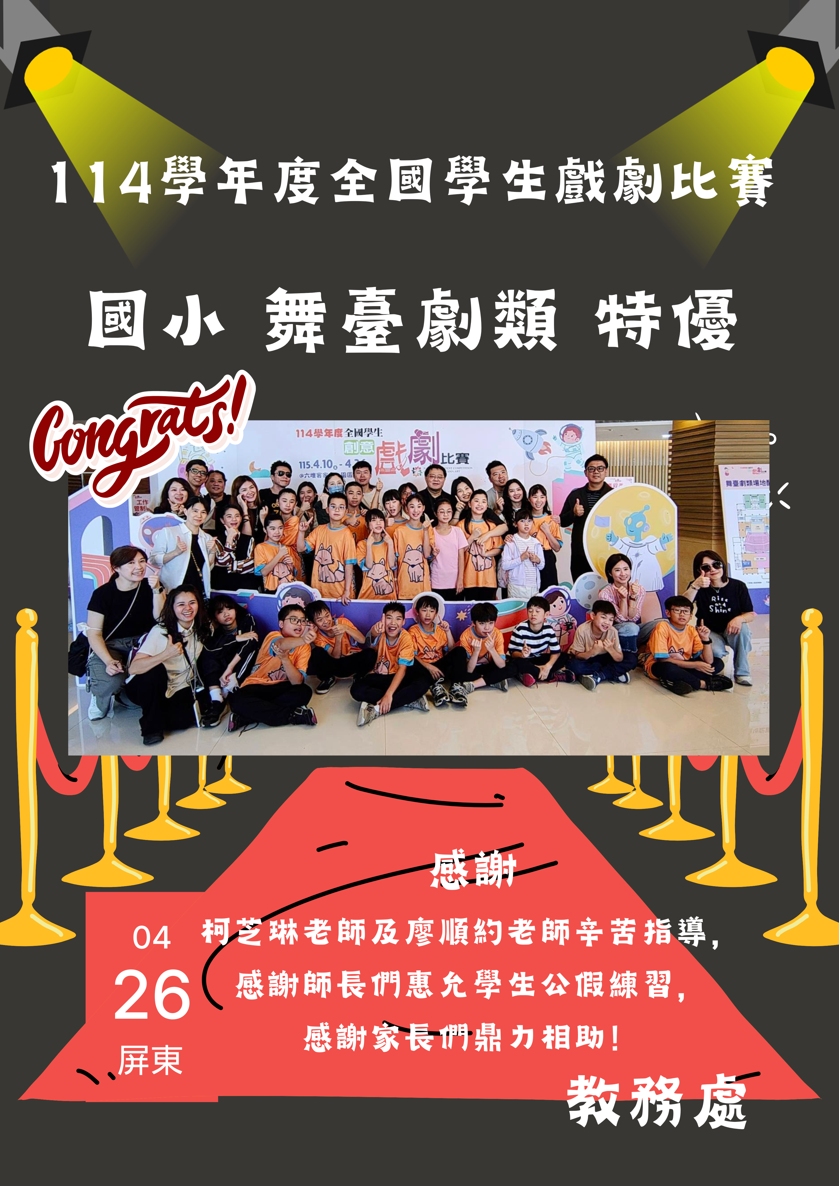賀!!!本校戲劇校隊參加114學年全國學生戲劇比賽榮獲國小舞臺劇組-特優!!!(將於05/14兒童朝會頒獎)