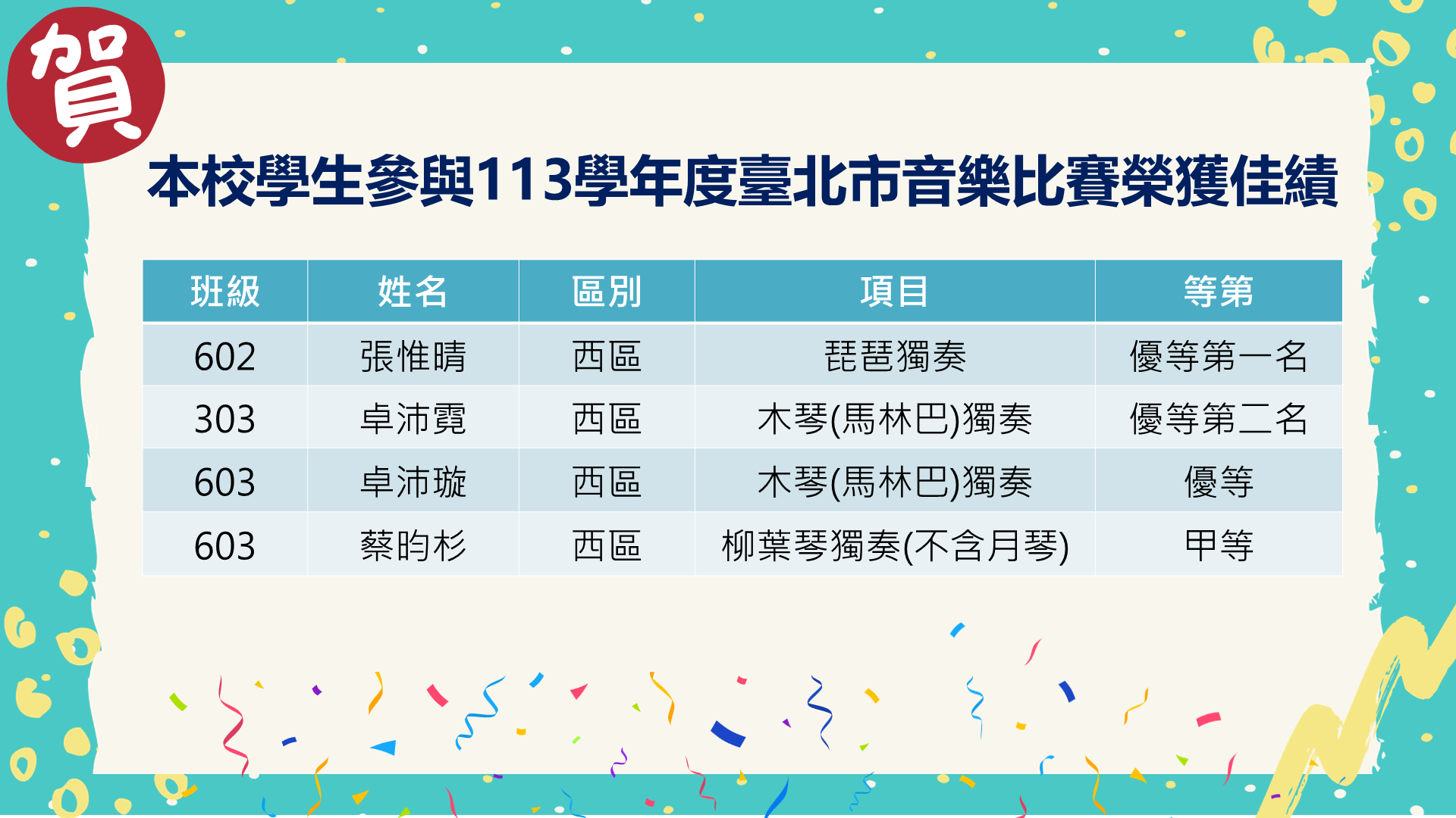 賀!本校學生參加臺北市113學年度音樂比賽 榮獲佳績!