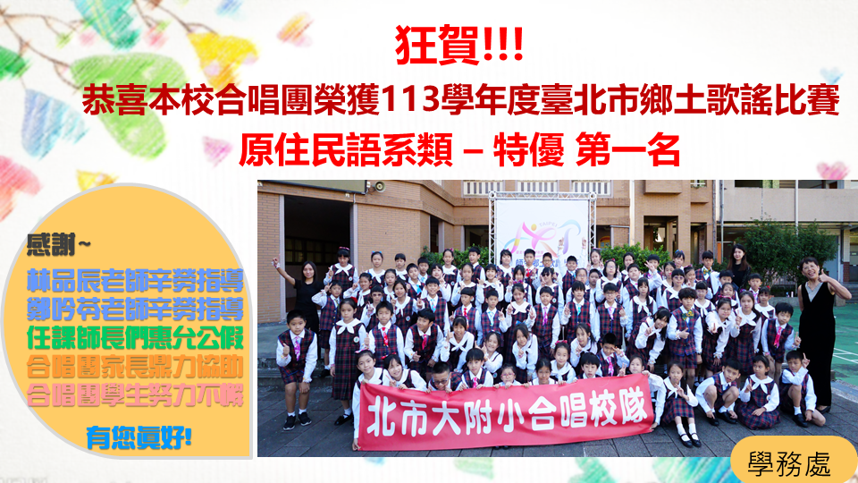 狂賀!!! 恭喜本校合唱團榮獲臺北市113學年度師生鄉土歌謠比賽 原住民語系類-特優 第一名(附比賽實況連結) 內含比賽實況連結:https://www.youtube.com/watch?v=uWtf811vGNE
