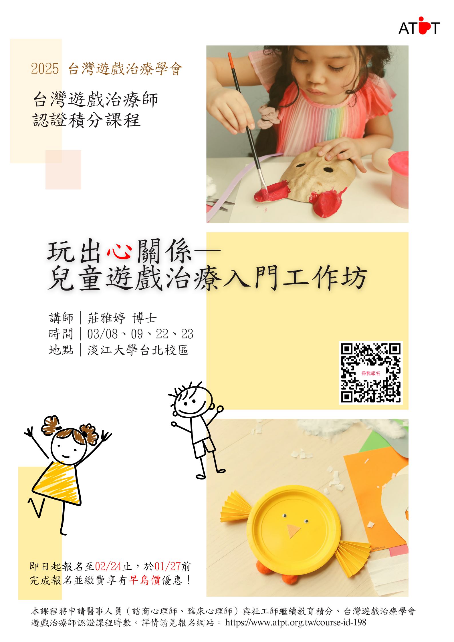 轉知:台灣遊戲治療學會將於114年3月8日、9日、22日及23日舉辦【台灣遊戲治療師認證積分課程】玩出心關係—兒童遊戲治療入門工作坊(北部場)