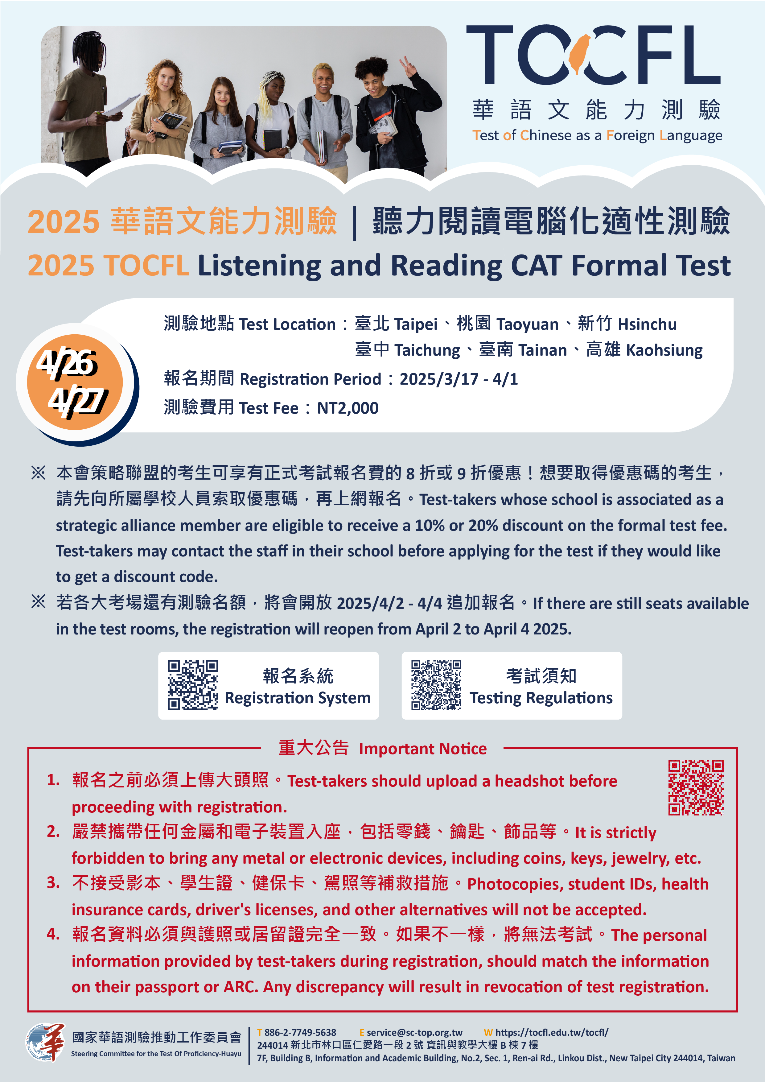 一、依據國家華語測驗推動工作委員會114年3月14日華測字第 1142000043號函辦理。