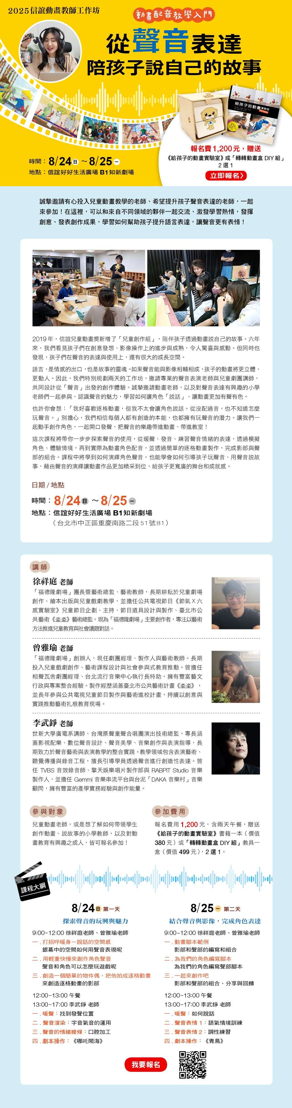 四、工作坊資訊如下: 時間:114年8月24日(日)及8月25日(一),上午9時至下午5 時,共兩天 地點:信誼好好生活廣場B1知新劇場(台北市中正區重慶南路二段51號B1) 師資陣容: 徐祥庭 老師|福德隆劇場 團長 曾雅瑜 老師|福德隆劇場 創辦人 李武錚 老師|世新大學廣電系 講師
