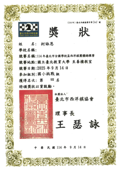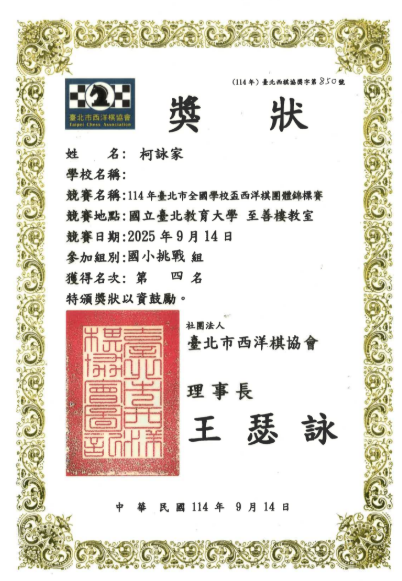 恭喜本校301柯詠恩、302柯詠家榮獲「114年臺北市全國學校盃西洋棋團體錦標賽」國小挑戰組第四名
