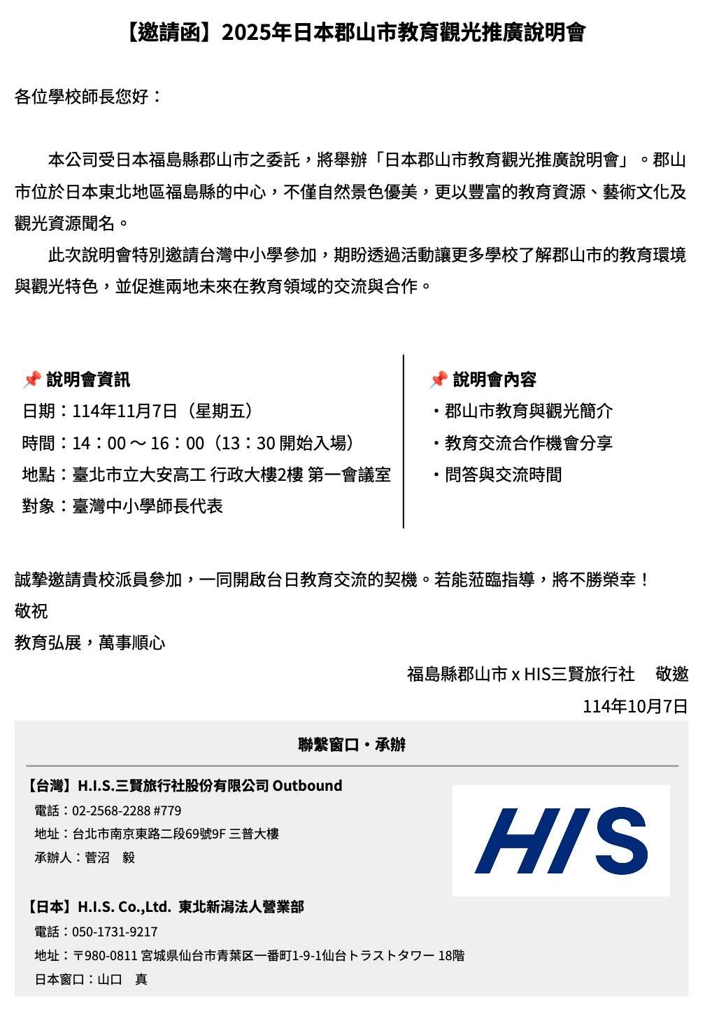 福島縣郡山市觀光政策課辦理「日本福島縣郡山市教育觀光推廣說明會」,詳如附件。