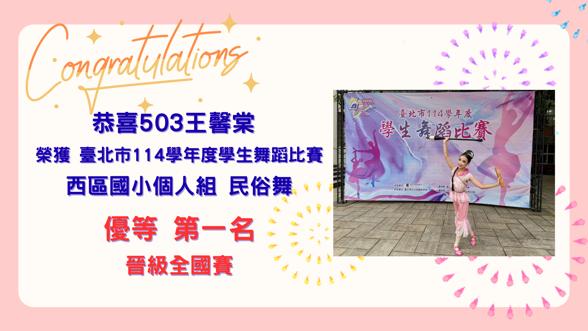 恭喜! 503王馨棠榮獲臺北市114學年度學生舞蹈比賽 西區國小個人組 民俗舞 優等第一名